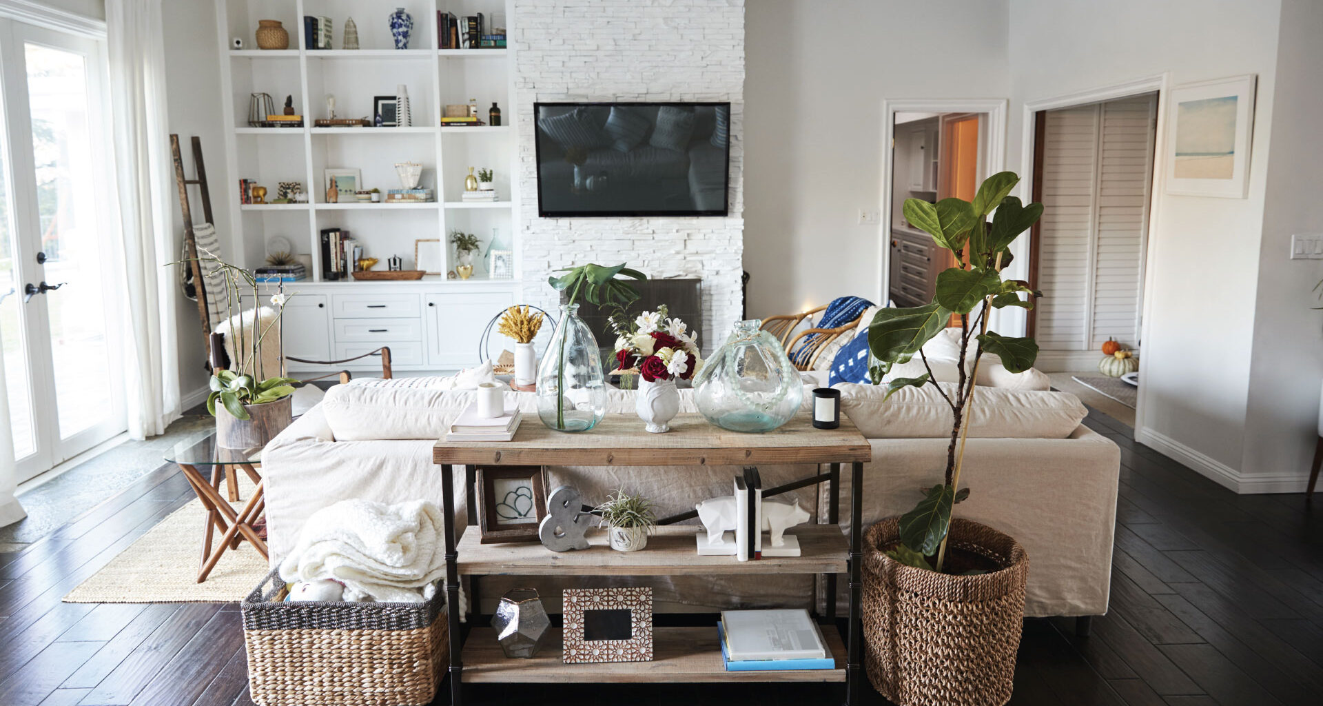Sure, our store sells plenty of modern TV stands, but my personal preference is to be creative and use a sideboard/console. Not only do they offer significant storage for all the things that will inevitably be in your living room, but they’re often aesthetically superior. See for yourself.