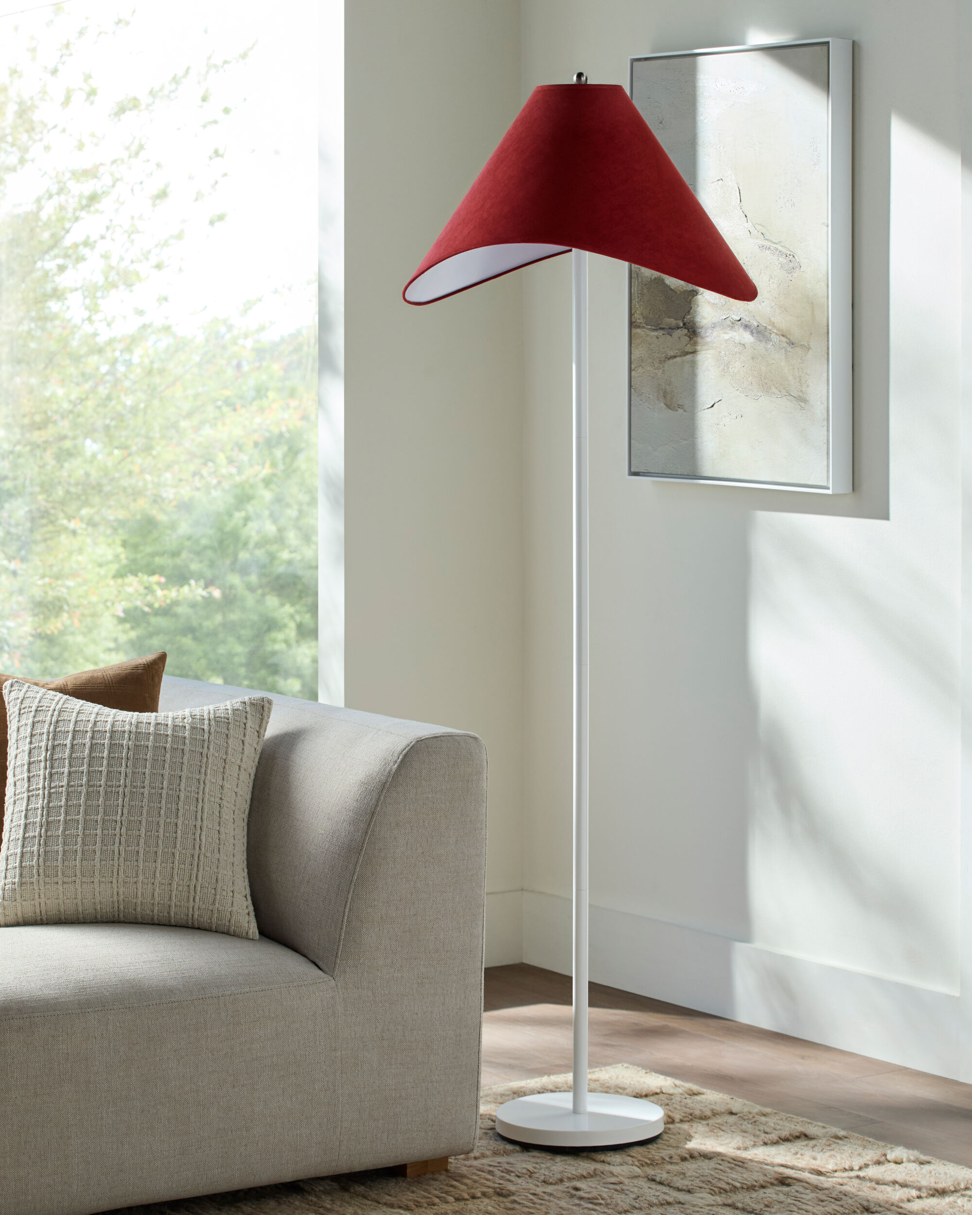 Mid-century modern floor lamps typically feature geometric lines combined with round, curved contour. The contrasting angles offer the lamps both elegance and boldness. Material-wise, mid-century modern lamps are constructed from brushed steel in silver, copper or gold tones. For example, the common starburst lamp features exposed bulbs on straight rods radiating out of a center.