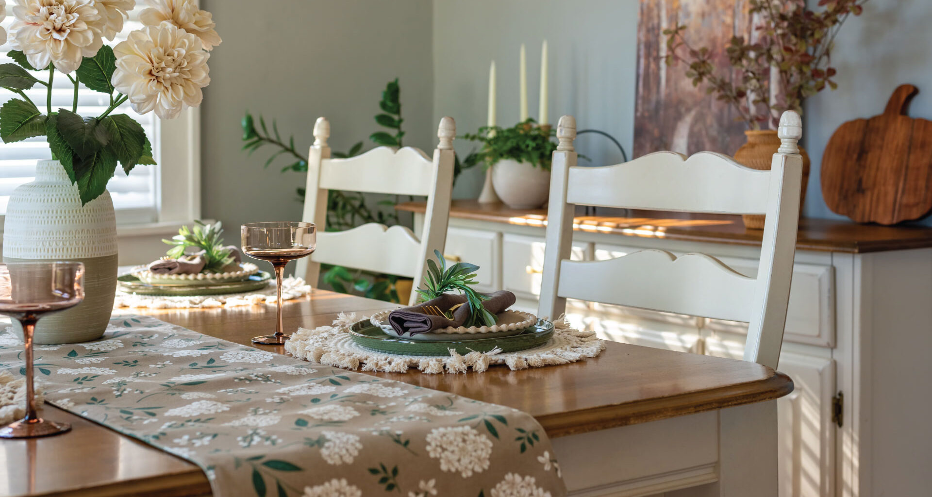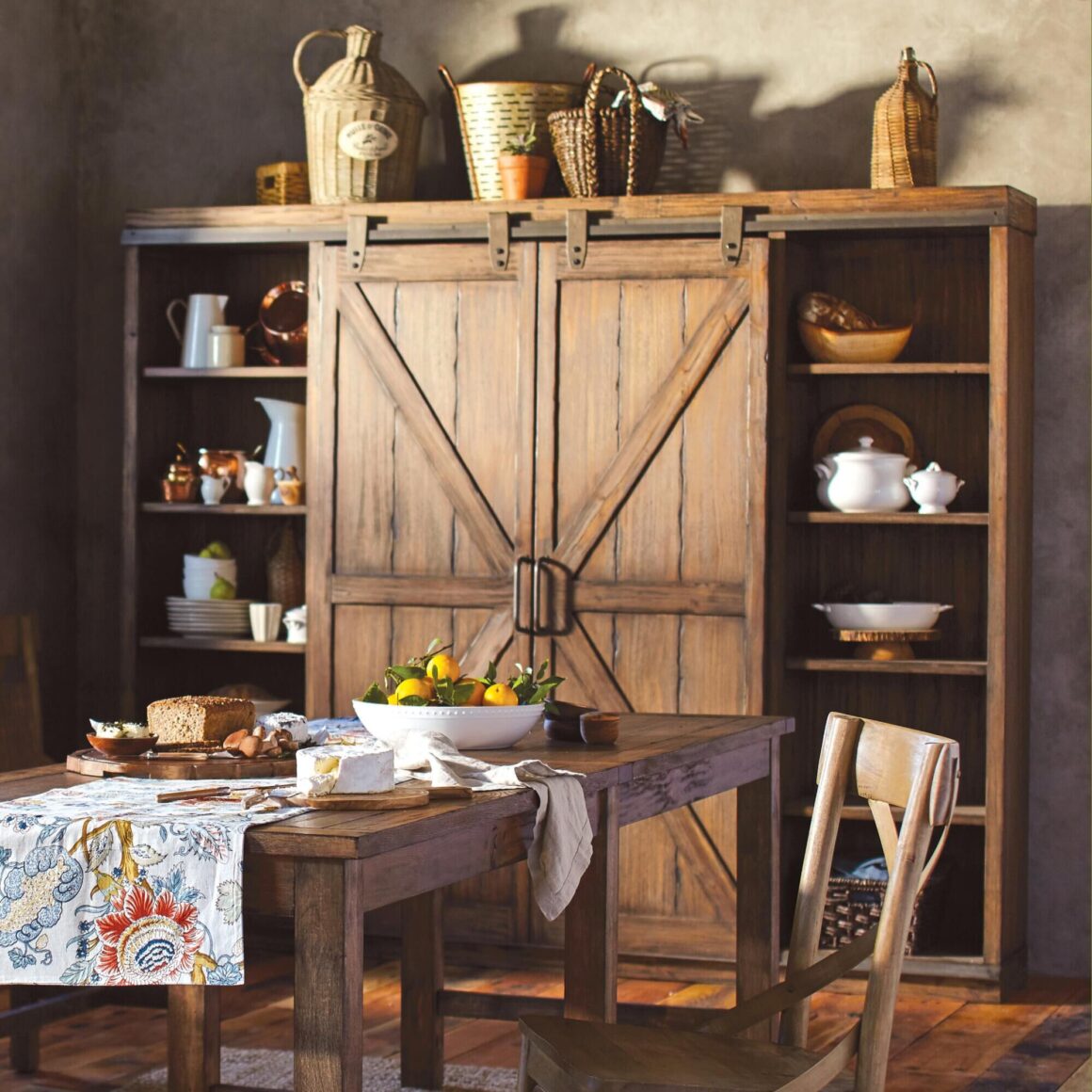 One thing that most people love about rustic farmhouse decor is how it creates a truly welcoming atmosphere. To give your kitchen this charm, Kathy Kuo Home’s collection of country farmhouse furnishings definitely hits the spot. Check out some of their eco-friendly options like the Lyle Lodge Reclaimed Pine Adjustable Dining Table. It looks like a typical farmhouse table but can sit anywhere from 4 to 14 individuals with a few easy adjustments. In addition, the Dauphine French Country Display Case Cabinet can show off your treasured china pieces or silverware. Lastly, accessorizing with unique pieces like the Alice Round Serving Tray will help set the mood.
