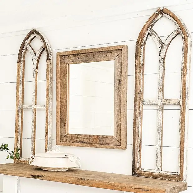 For the ultimate treasure trove of rustic farmhouse furniture, Bassett Furniture has an incredible selection of decorative nightstands, bed frames, and dressers. Tying different pieces together can be tricky, but they have all the wooden finishes you can dream up. As one of the best stores for farmhouse decor, they offer the Custom Made Maple Farmhouse Table which is ideal for family meals and candlelit gatherings. In addition, the McDaniel Clock has an aged appeal and easy-to-read iron numbers on top of a pine finish. To make a small space feel more open, add a vintage-inspired wall mirror to bring in a lighter element. Above all, using soft colors like dove grey and white will show off the natural wood grain.